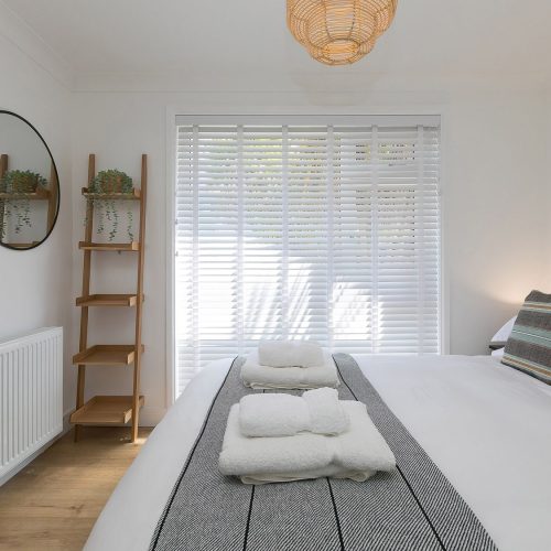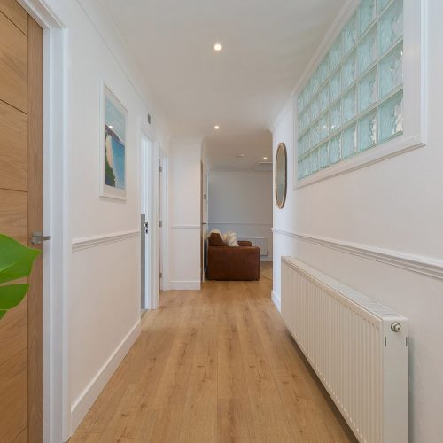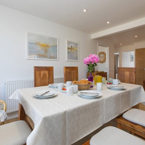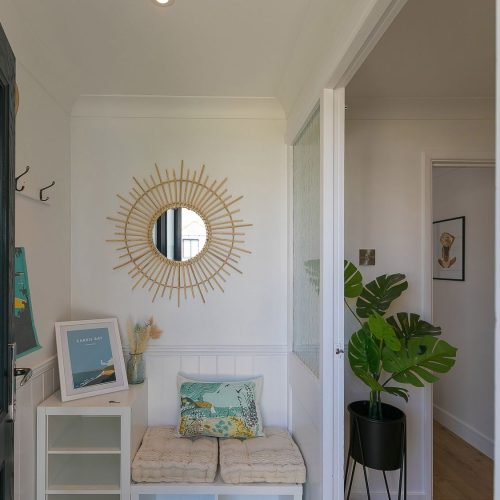 Enter into the crisp white walls of the porch on arrival, admiring the coastal hues and neutral décor and making use of the space to store shoes and coats.