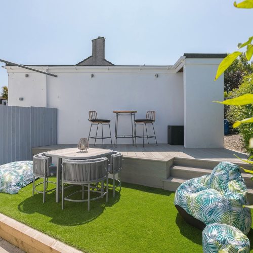 - Rear garden with two decked areas, outdoor seating, an AstroTurf area, a bistro bar, and an outdoor tap