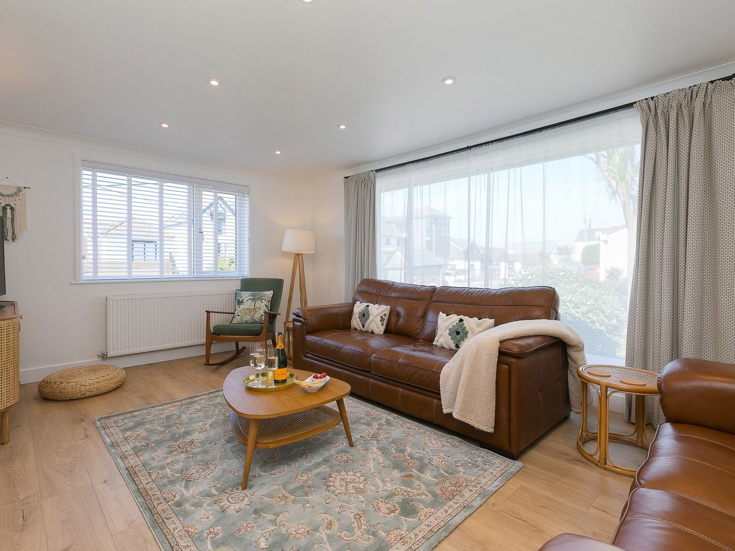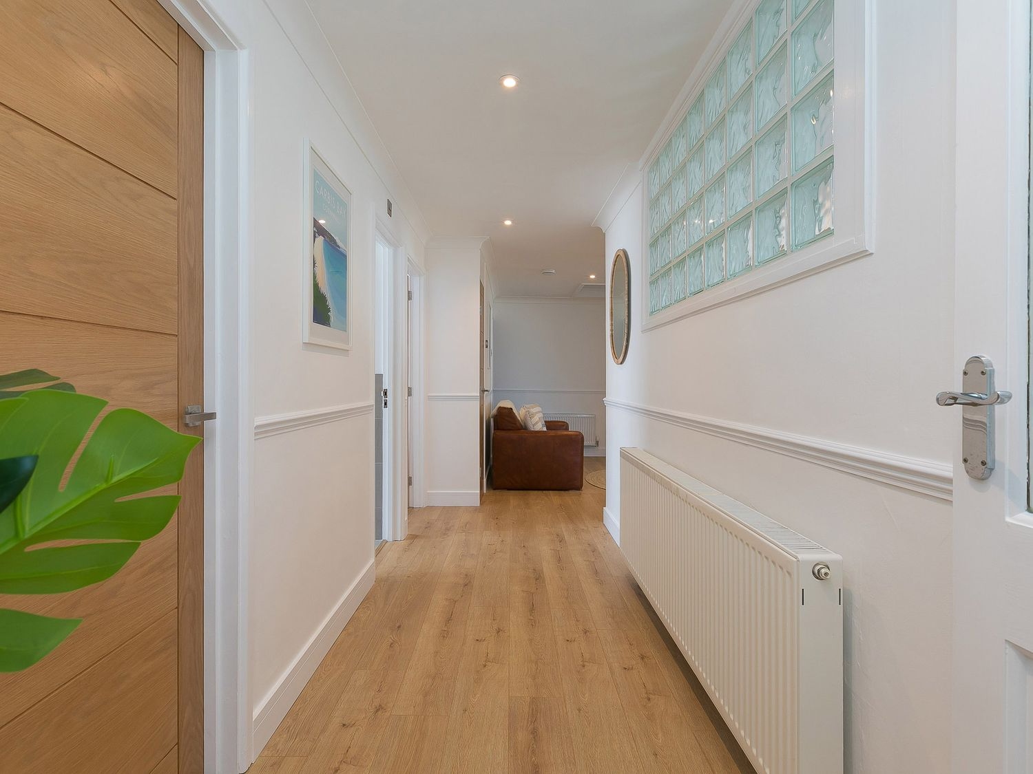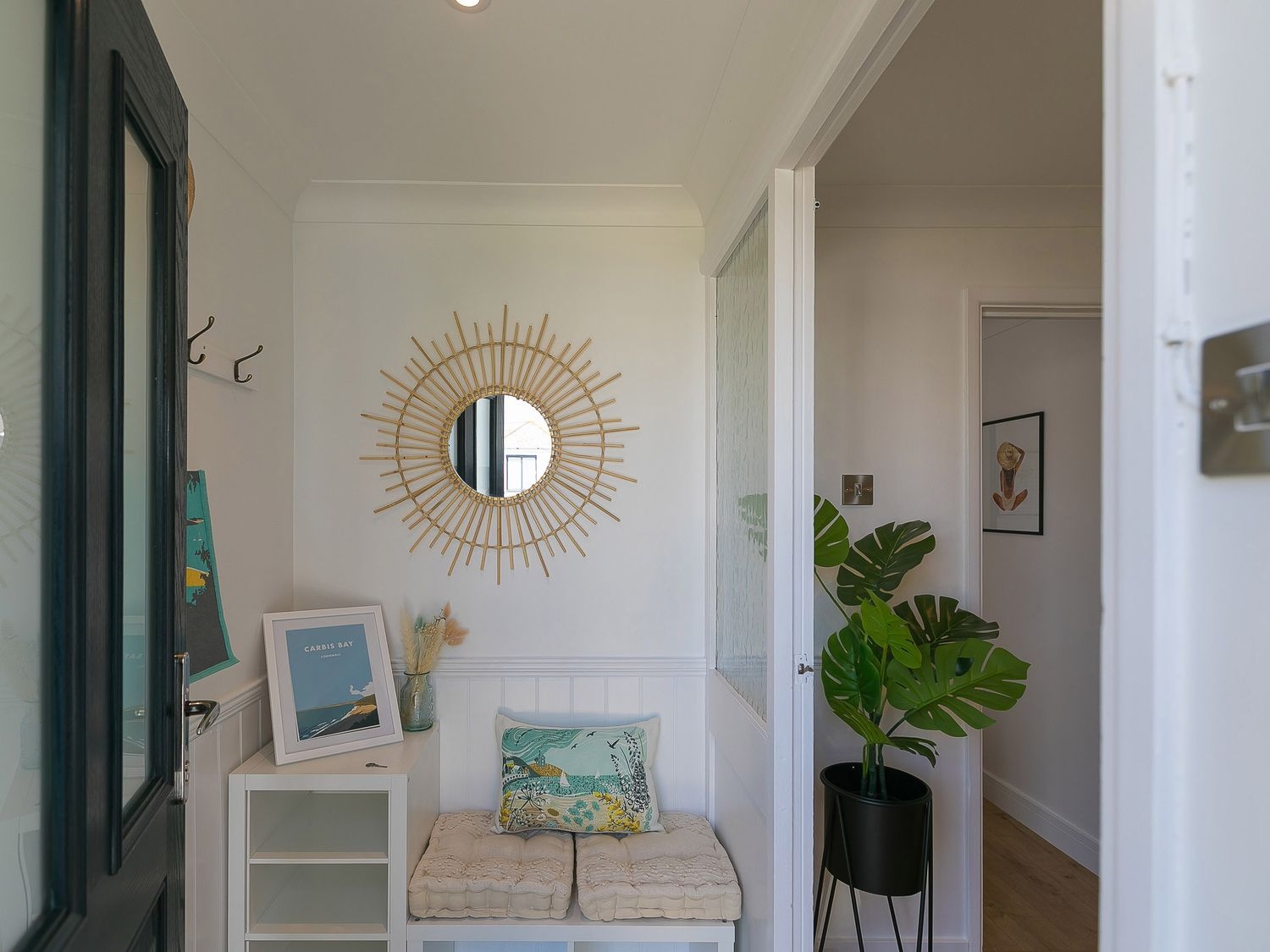 Enter into the crisp white walls of the porch on arrival, admiring the coastal hues and neutral décor and making use of the space to store shoes and coats.