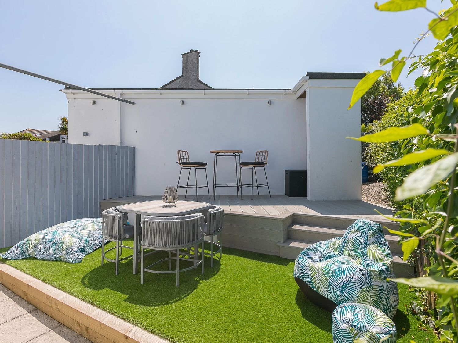 - Rear garden with two decked areas, outdoor seating, an AstroTurf area, a bistro bar, and an outdoor tap