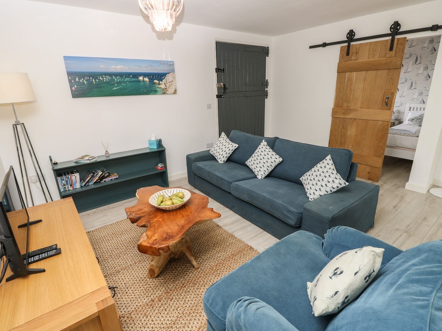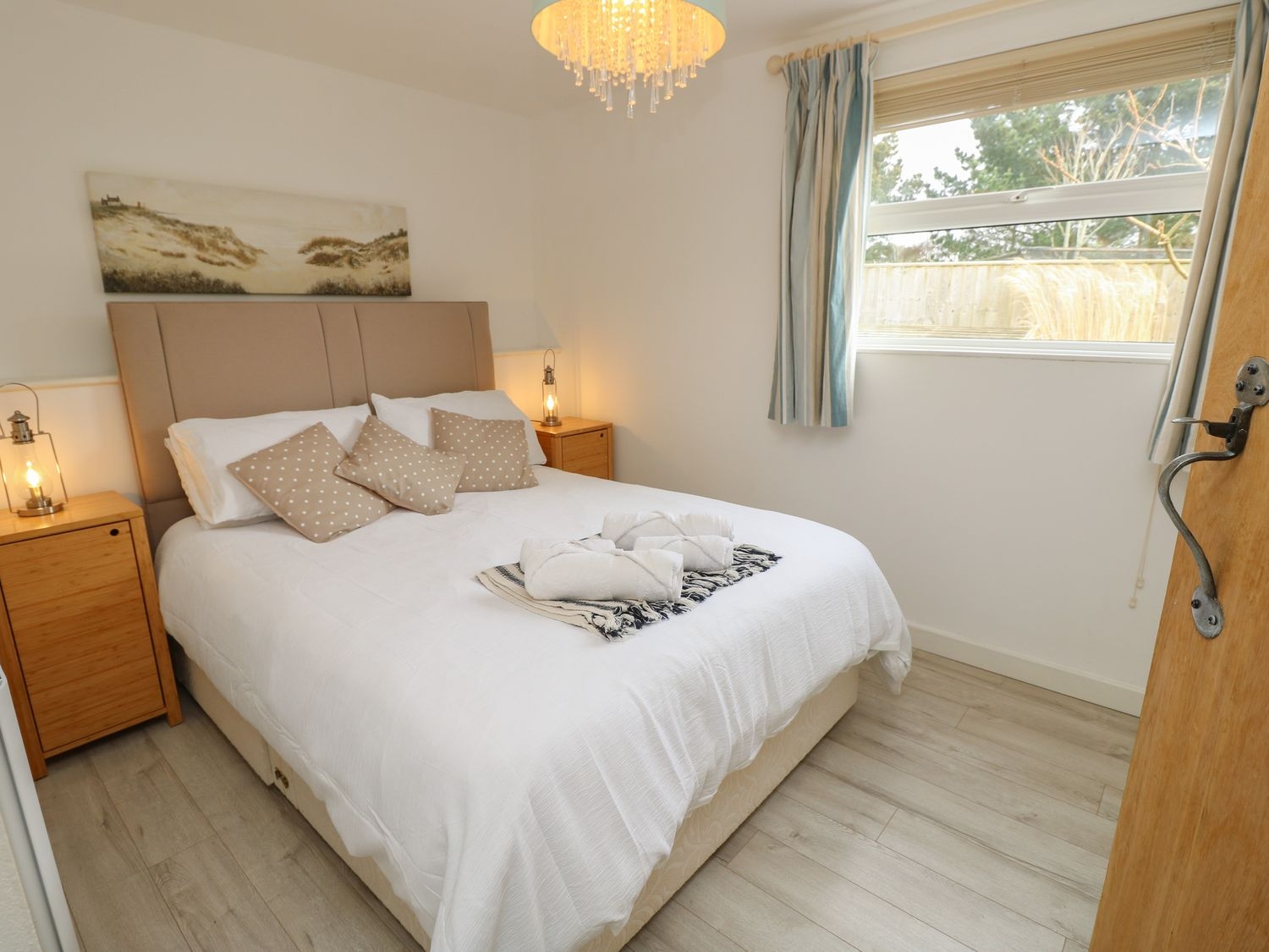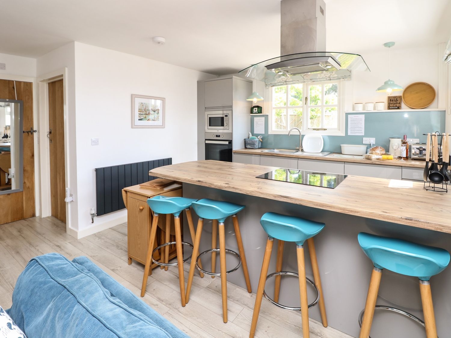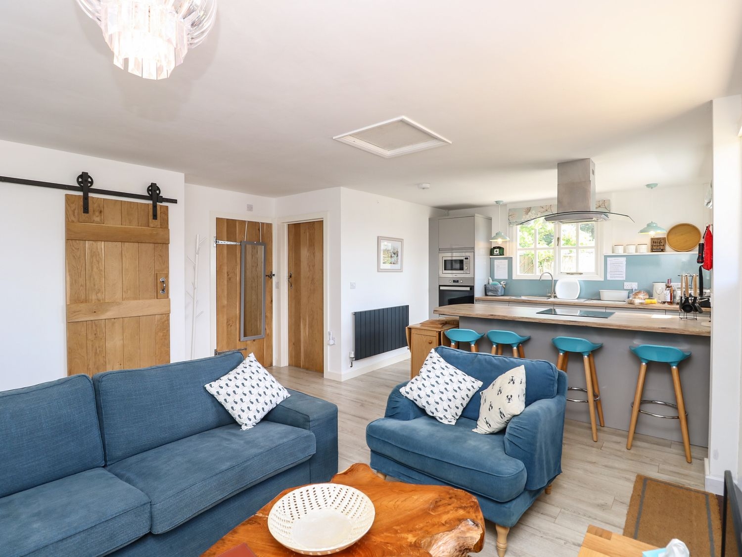 Head indoors to be greeted by the living area, complete with plush sofas, a breakfast bar for four, and a sleek kitchen, with all the essentials for a self-catered stay; prepare meals, dine, and unwind with the Smart TV for some light entertainment.