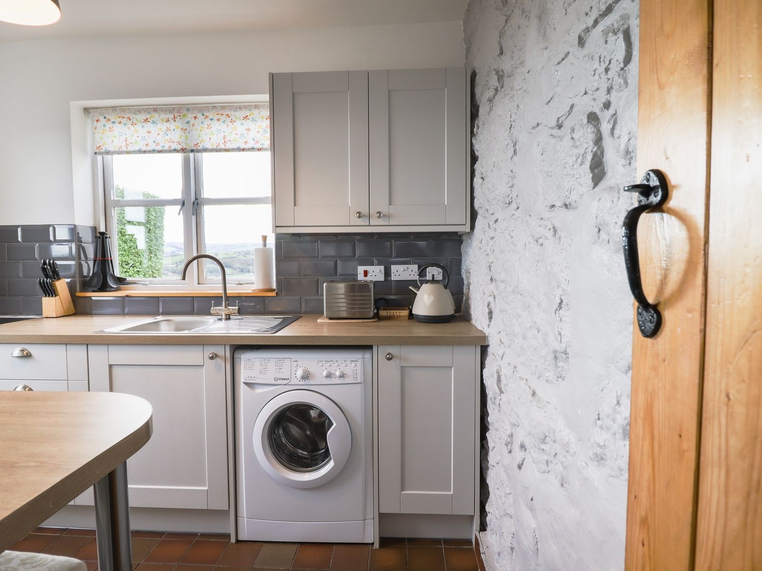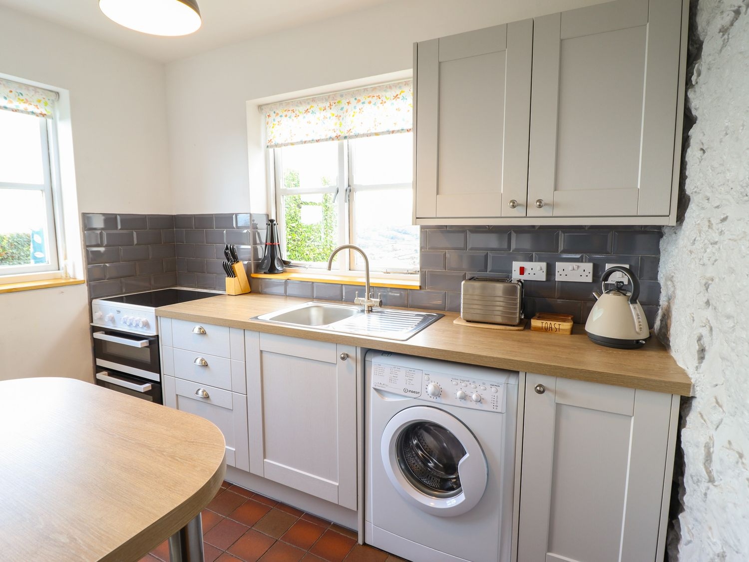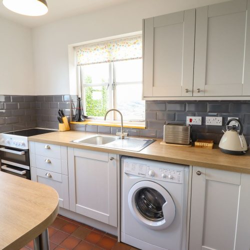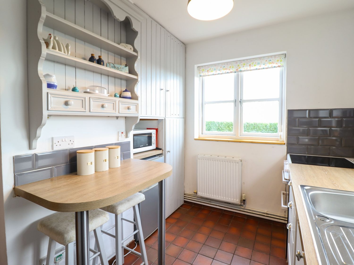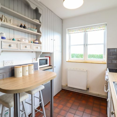 The fitted kitchen is well equipped and offers seating at a breakfast bar from which to enjoy the sea views.