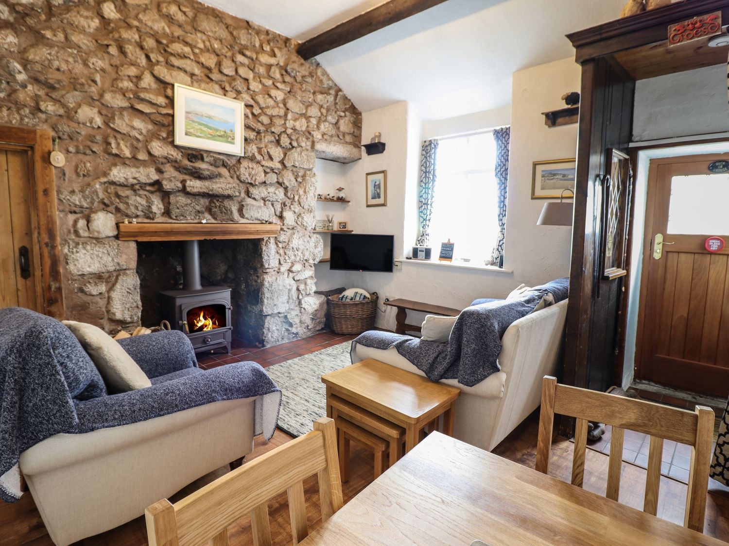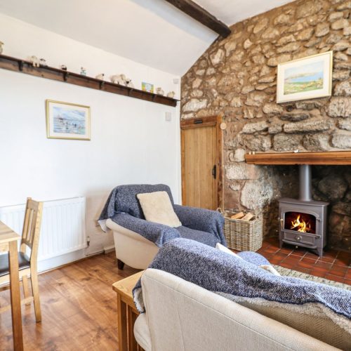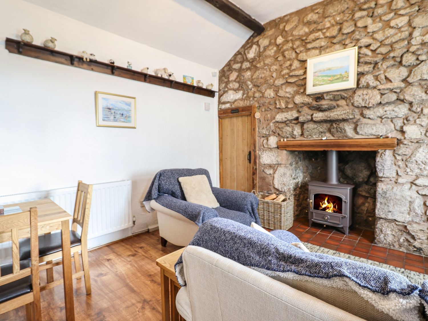 The sitting room continues the traditional character of this Llandudno cottage, with exposed beams and stone wall, and a woodburner to keep you warm in the evening after a long walk along the coast.