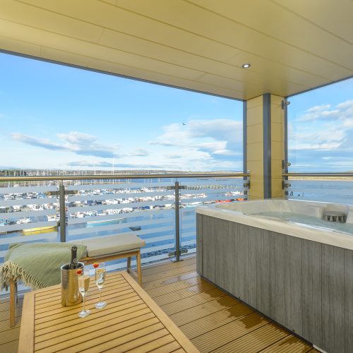 This Luxurious Holiday apartment offers stunning views out to sea from the Hot Tub in the heart of it all in bustling Amble, Northumberland, just moments from its vibrant Harbour Village and a short stroll into the town centre. Harbour Village, only metres away, lines the water’s edge with its colourful row of pastel beach huts, home to independent gifts, unique crafts, and freshly caught seafood.