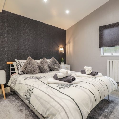 Enter into the sleek, monochrome kitchen area of the open-plan living space and admire the good range of appliances on offer, including an electric oven and gas hob, microwave and fridge/freezer, sure to be of assistance on your self-catered stay.